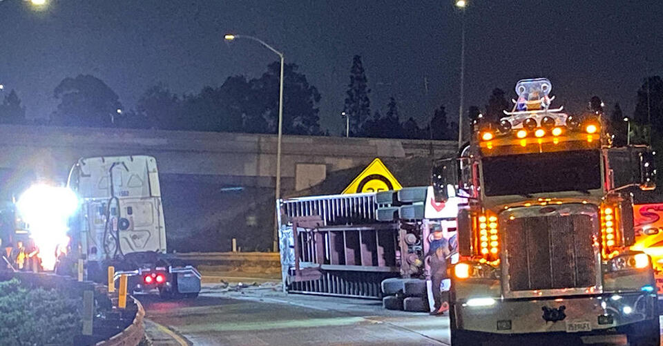 Crews worked for hours to remove a big rig that overturned on a freeway transition road in the Cerritos area.The big rig crashed at about 2 a.m. on the transition road from the eastbound 91 Freeway to the northbound 605 Freeway. The driver was not hurt, and was able to get out of the cab on his own.It's unclear what caused the crash, but the big rig remained on its side on the freeway transition road for hours, thwarting the start of the morning commute.The Sigalert for the traffic incident was finally canceled at 9:32 a.m., and all lanes were reopened.